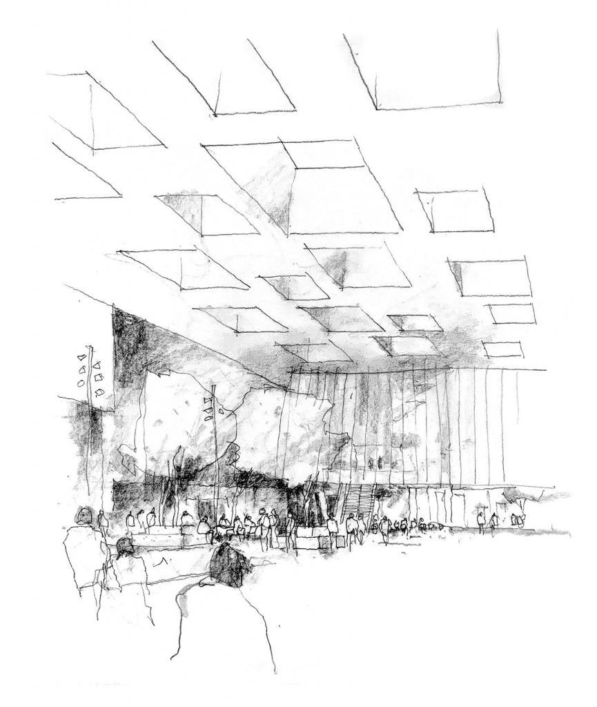 The internal plan is simple and open, with all five levels anchored by a grand circulation galleria. Back-of-house and loading is cleverly concealed beneath a sloped artificial landscape, allowing a generous public interface and connection to the parkland on all sides.”