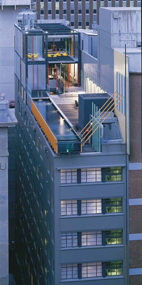 Characterised by bespoke furniture, sticks, stainless steel, aluminium and coloured planar surfaces, the hotel featured a radical 25m glass enclosed swimming pool extending over Flinders Lane street frontage at roof-top level.