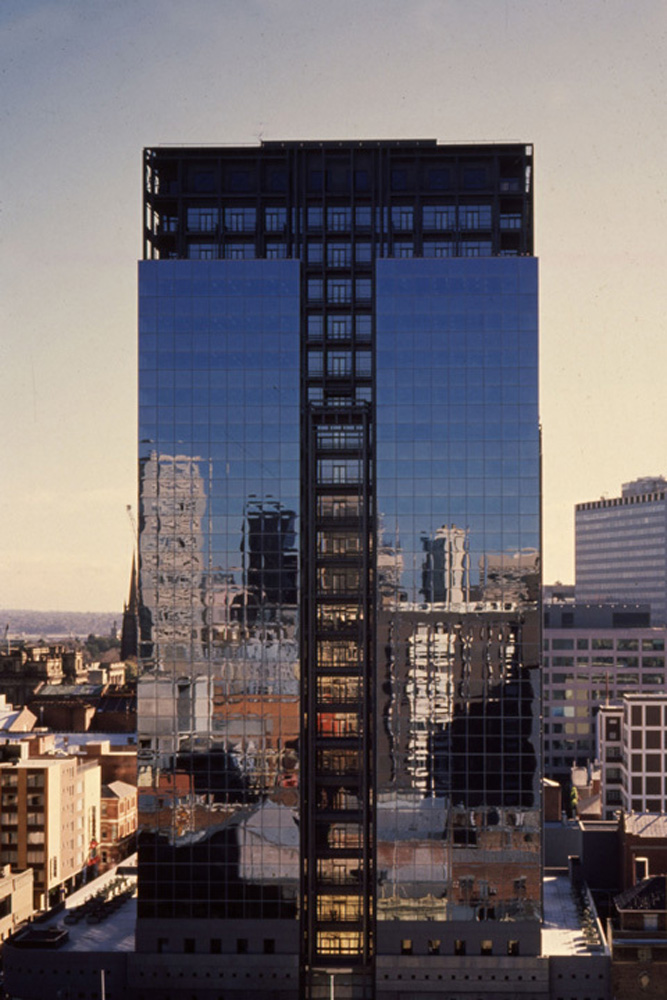 The design demanded sensitive handling of building scale, texture and form.  The tower sits over a textured masonry podium and consists of four flush-glazed corner shafts welded together by a decorative steel grillage of balconies that form a crown at the top.