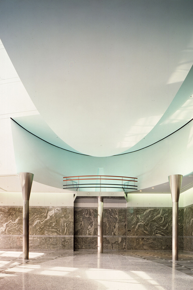 The articulation of the heavily textured grillage with the slick flush glazing of the corner shafts, reduces the visual impact of what is a relatively bulky form.