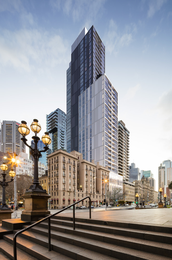 A tall, slender glass shaft defines the eastern Spring Street façade, articulated with balconies, winter gardens and panoramic windows.  This clear glass treatment opens up the face of the building to embrace and ‘breathe in’ the spectacular green visual experience of the Gardens and distant views of the Dandenong Ranges.