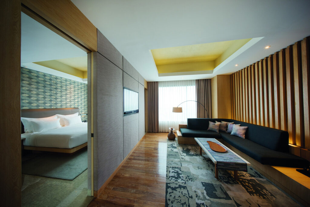 Internally, a batik installation stretches along the lobby’s ceiling like a floating curtain. The guest rooms are softly accented by light timber and dreamy murals inspired by wayang (traditional Indonesian puppet operas), with views of the 300 year old city and the imposing silhouettes of the volcanoes surrounding Solo.