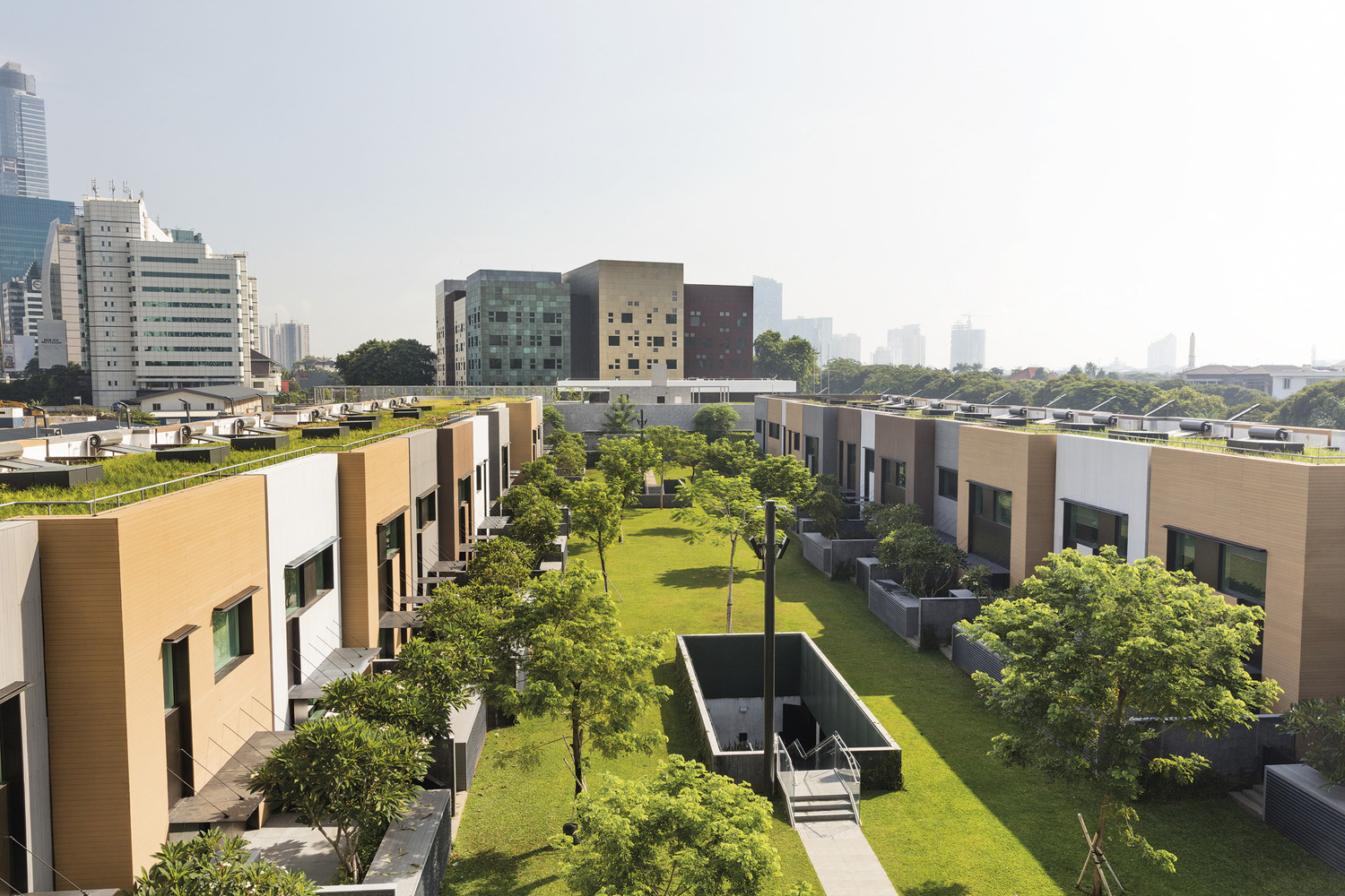 The staff residences are developed as two undulating two-storey buildings with grass roofs.  Set within a private and secure garden setting, the individual houses are stepped in and out to provide identity and articulation to the frontages.  Each home is clearly identifiable by individual cladding pattern, colour and abstracted graphic pattern.