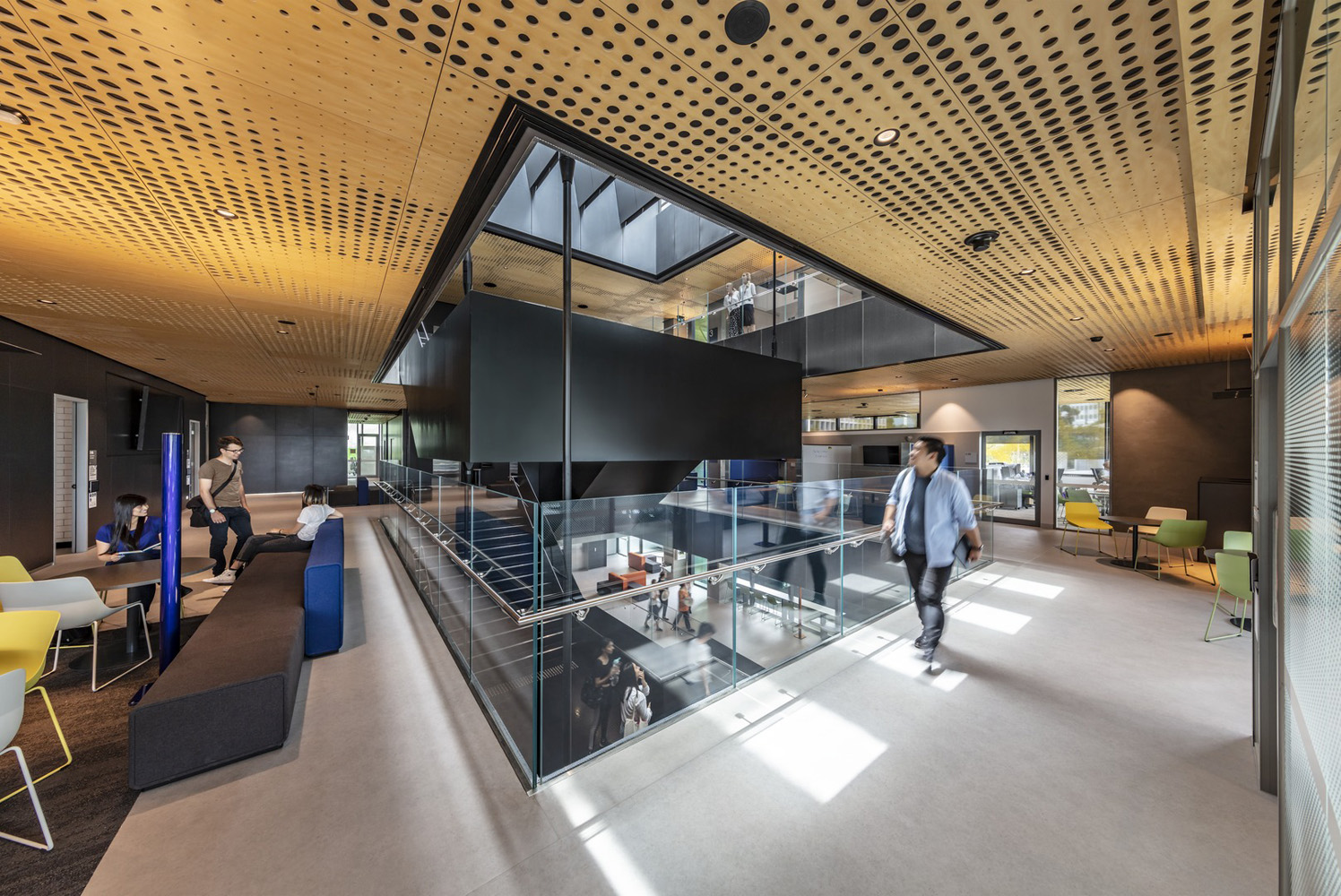 The facility also includes a 1,200m2 informal Learning Hub accommodating 440 students. With an average of 90 informal learning seats per floor, the Hub provides spaces for quiet, self-directed learning as well as, larger, more active group settings.