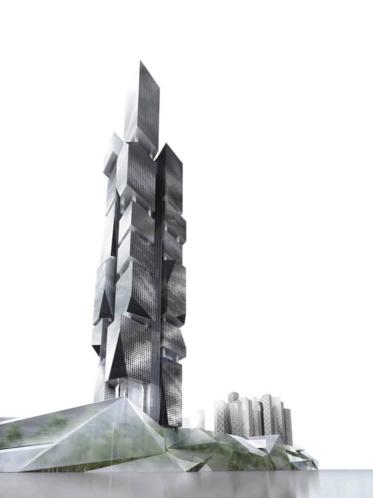 The towers, which accommodate the office, hotel and residential uses, become striking complementary forms that integrate and appear to grow naturally out of the podium.  The overall composition can be perceived as three distinct elements: podium, cluster office tower, residential/hotel towers.