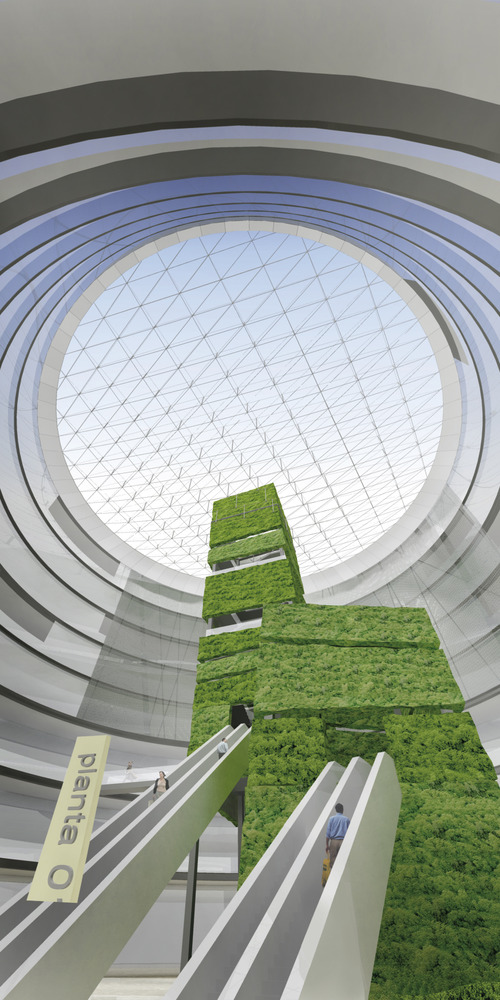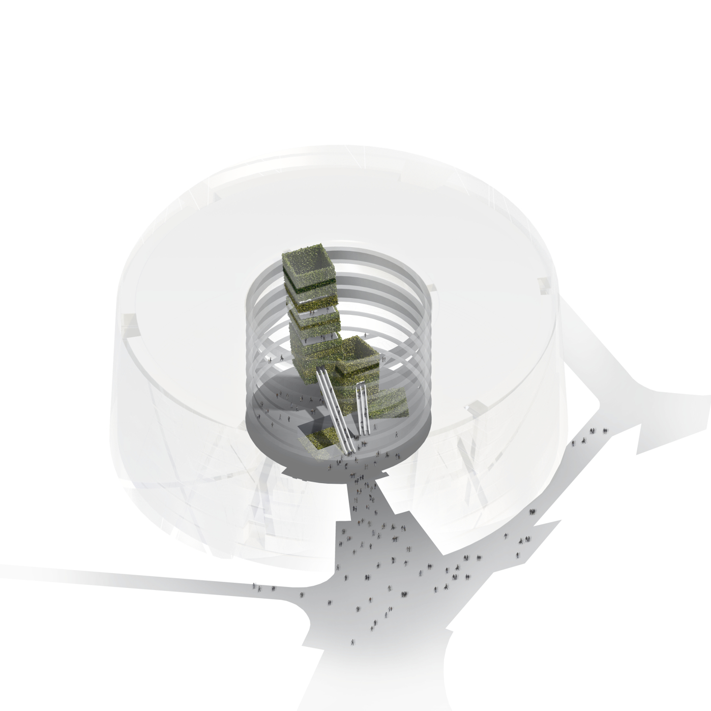 Two green towers located in the centre of the atrium become focal points within the space and contain the main vertical circulation for the public.