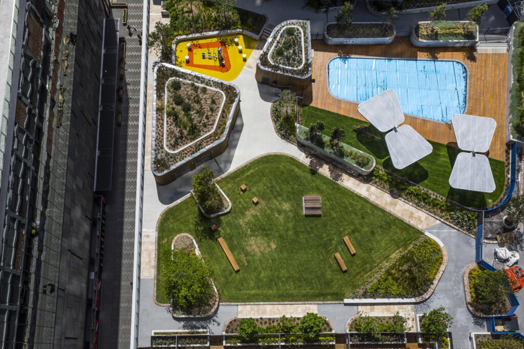 A shared podium with a landscaped roof and timber-clad low-rise block, fronts the new public square and boulevard.