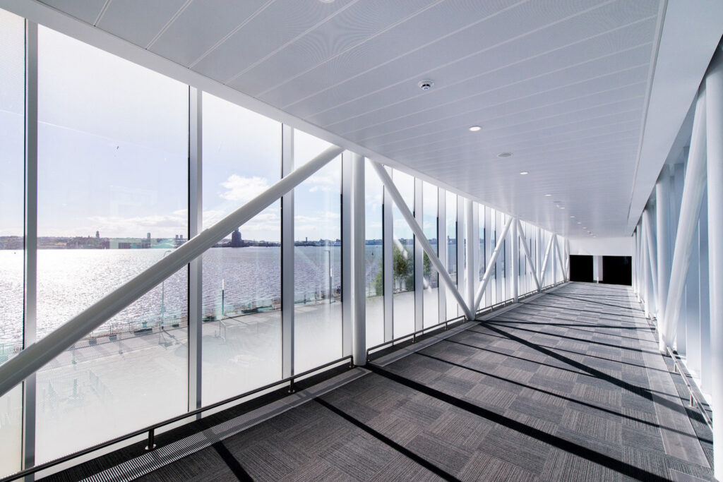 The language and materials of the main facade draw on the industrial heritage of Liverpool’s historic dock structures. The public concourse’s glazed ribbon wall provides the public face of the building and is where all movement and activity takes place as it curves beneath the composed and solid level two plinth.