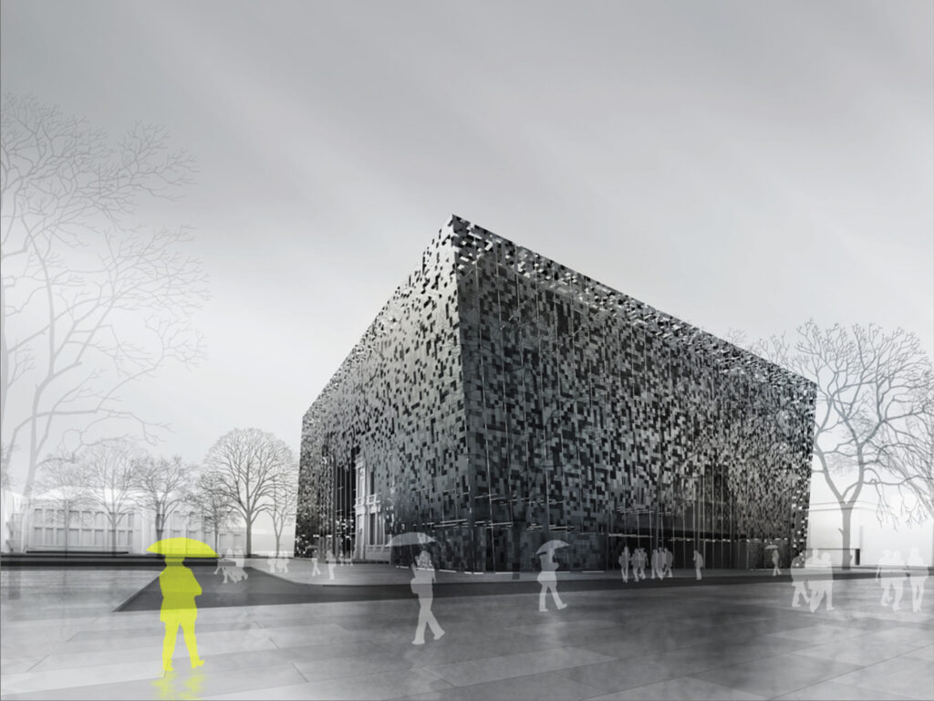 With regard to form and expression, as a place of teaching architecture, the building must express an essential defining characteristic that is about idea and content rather than style.  We proposed clothing the building with an environmental skin or veil.  Its effect is to give visual expression to the simplest of architectural forms – the box – with an imagery that is simultaneously neutral, powerful and expressive.  The skin embodies the essence of architecture: form, articulation, volume, containment, solidity, transparency, structure and surface.