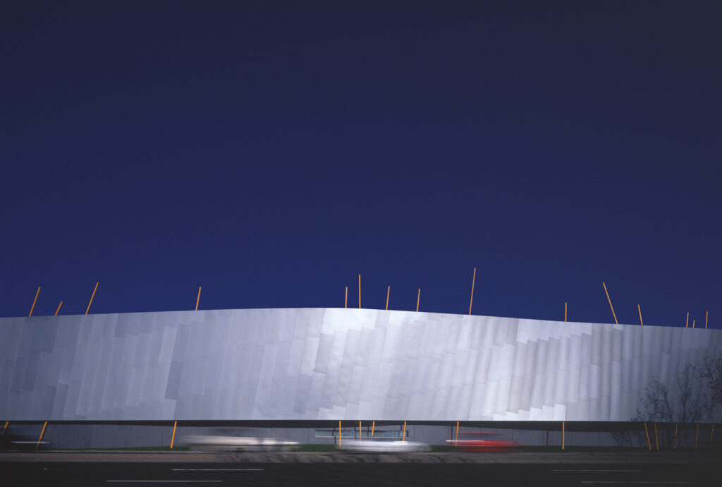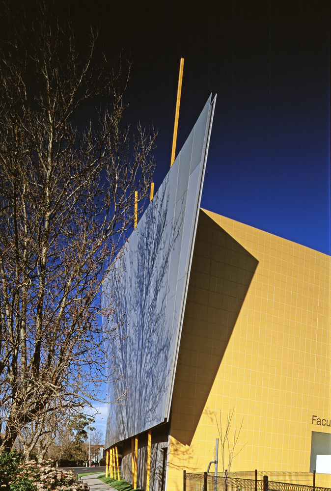Sited on one of Melbourne’s busiest suburban roads, the building turns inwards to an internal courtyard. Its outer wall undulates along the road and is clad with a metal skin, held up by a series of yellow sticks. Viewed at speed along the highway, the image of the campus is defined by the dynamic silver wavy wall. Its anodised aluminium shingles produce a dramatic sculptural impact.