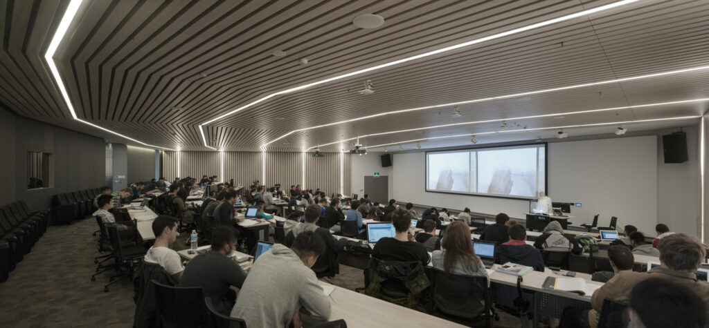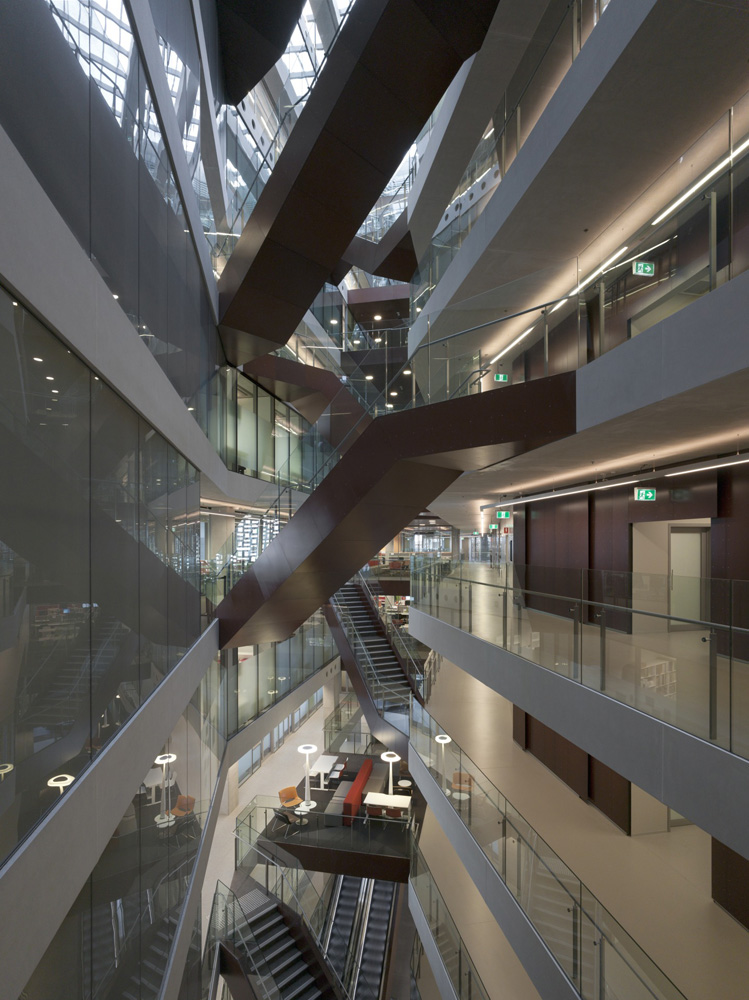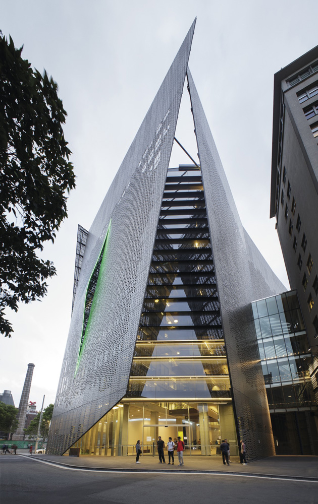 Fourteen levels, plus four below ground, accommodate state-of-the-art lecture rooms, academic offices, seminar rooms, teaching and research laboratories, student union, food and recreation areas, with bicycle and carparking. Educational spaces are arranged around a central atrium or crevasse creating a variety of innovative pedagogy and collaborative environments.
