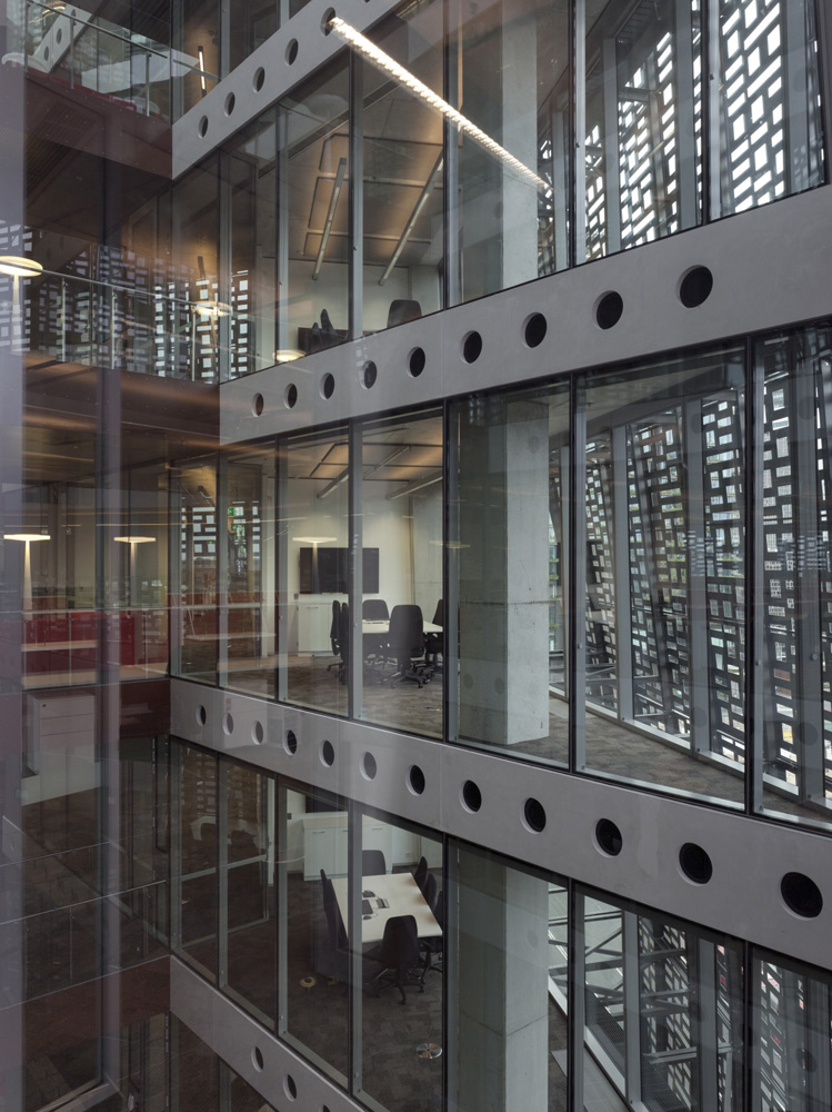 Four tilted and skewed plates envelope the building’s volume. The plates are made of aluminium sheets perforated in a pattern derived from the binary code for ‘University of Technology Sydney Faculty of Engineering and Information Technology’. ‘Gills’ creased into the surface of each plate punctuate the façade, visually reinforcing the sense of plate as skin and symbolically allowing the building to breathe.