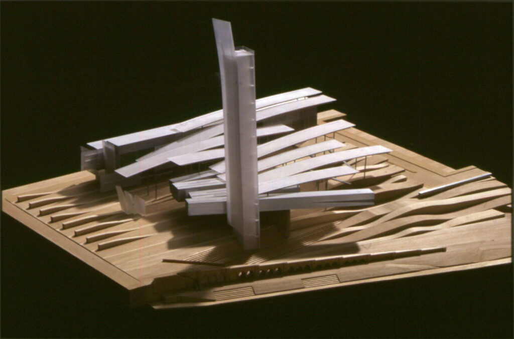 The centrepiece of the design was a 100 metre transparent steel and glass tilting tower. A symbolic gesture containing only a viewing platform, it paid respect to the cathedral spire adjacent and the nearby tower of the Arts Centre. It would become an urban icon /marker for Melbourne focussed on a narrative about the Federation of Australia.