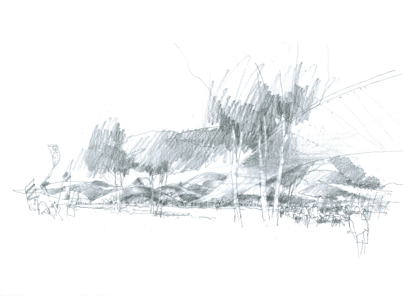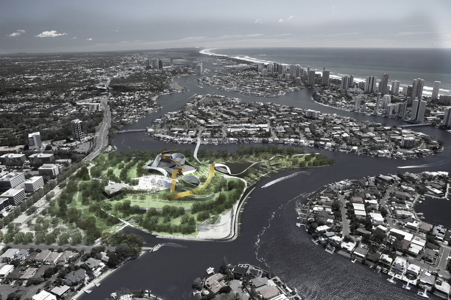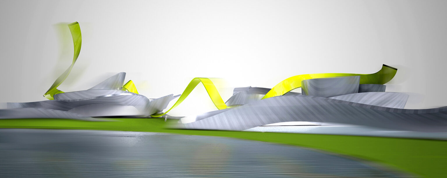 Like ripples created by pebbles dropped into a pond, ribbons spread out from the cultural precinct, sweeping through the landscape and across the water. Formed from metal sheet and sculpted landform, the ribbons interweave built-form, landscape and water with art, performance and events. They overlap and intertwine, enveloping existing buildings and forming new spaces, curving and diverging to define indoor volumes and outdoor spaces, inclining to create shade, shelter and pavilions in the park.
