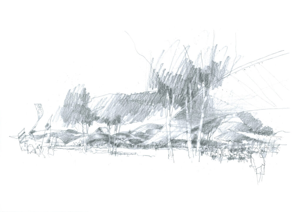 The buildings, ribbons and terrain form an armature that frames ‘whirlpool’ spaces woven through the site, overlapping at powerful junctions. The amphitheatre and the key building entries converge at the Great Terrace. This central space is the main centrifuge that draws from, and in turn contributes to, the surrounding elements.