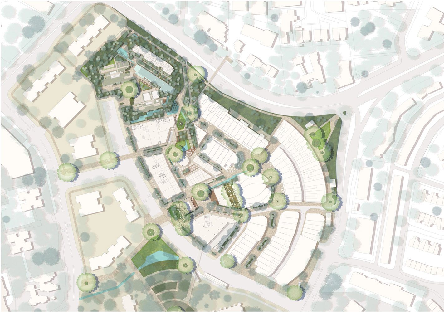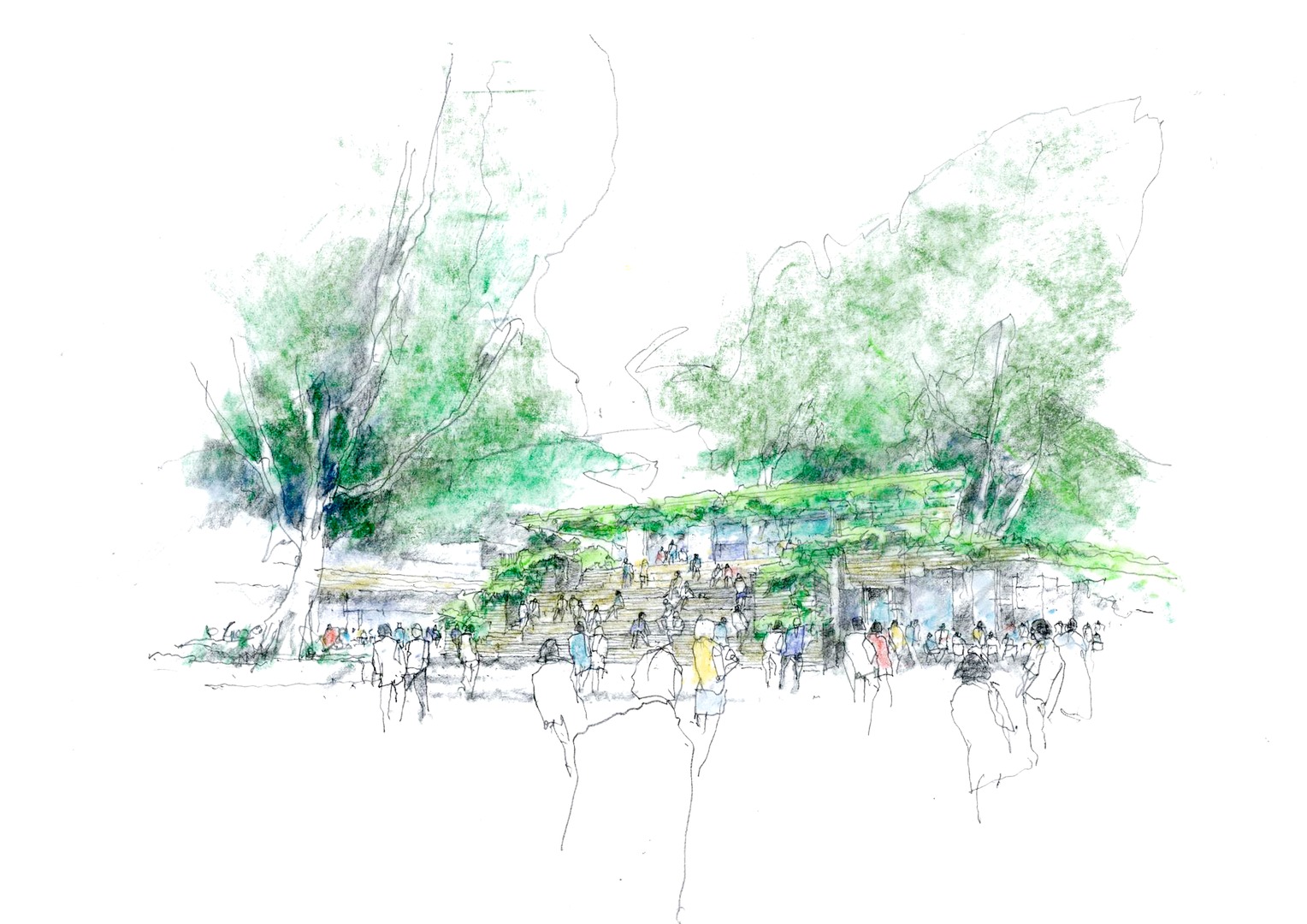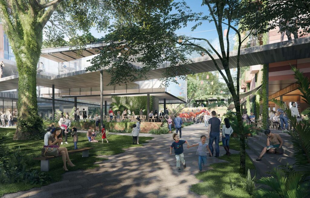 The masterplan proposed 10 buildings of varying scales and uses, including intimate, low-rise retail, commercial and entertainment. Two ground planes of activated public realm and pedestrian laneways seamlessly connected into the existing village street network. A unique range of public spaces included a public square, and amphitheatre, outdoor cinema, a lush, terracing pocket park and playground, elevated pedestrian connections and landscaped public rooftop terraces. The architecture responds to Singapore’s tropical climate and image of a ‘City in a Garden’, with deep shaded, outdoor dining spaces, extensive facade greenery and lush landscaping.
