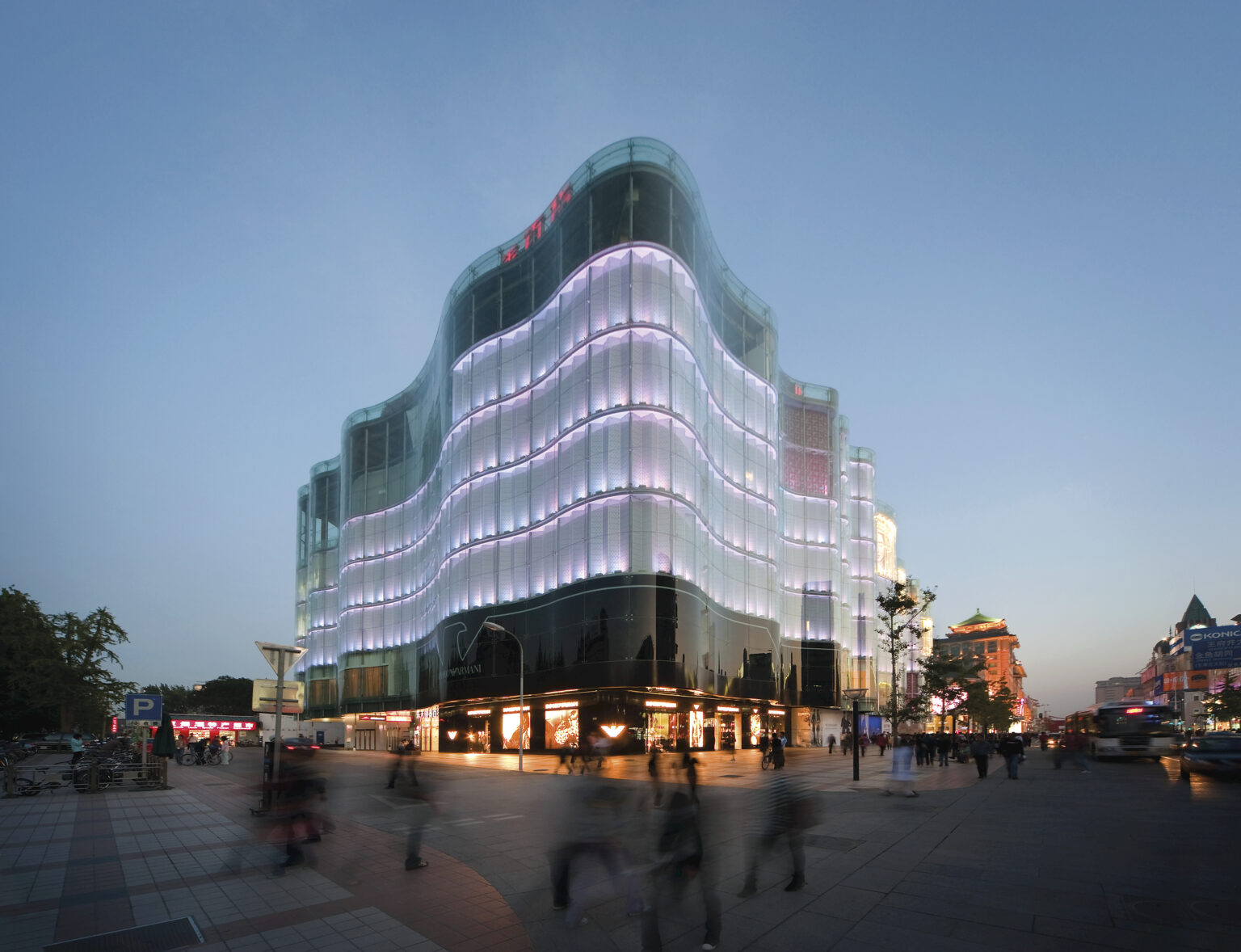 Responding to its historical artistic context and contemporary program of uses, the building is conceived as a theatre behind a transparent glass stage curtain. The glass curtain provides an opportunity to view, in select spots, an interior of colour, movement, advertising and display visible to Wang Fu Jing and Jin Yu Hu Tong Streets.