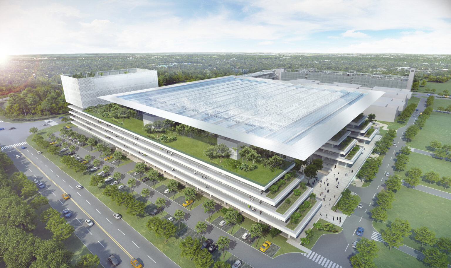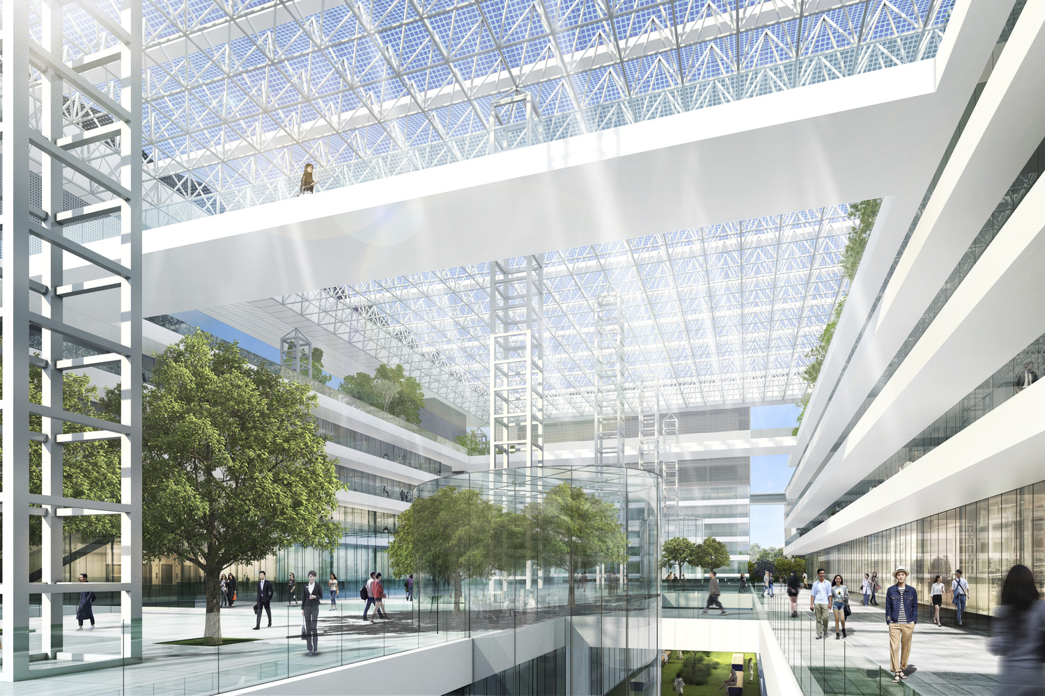 The development comprises four office buildings featuring green roofs at various levels encompassed by a 1.8 hectare ‘mega roof’ floating high above the buildings to enable cross air flows, weather protection, rainwater harvesting and energy capture. The entire roof is comprised of solar panels that also act as shade devices to reduce thermal loads.