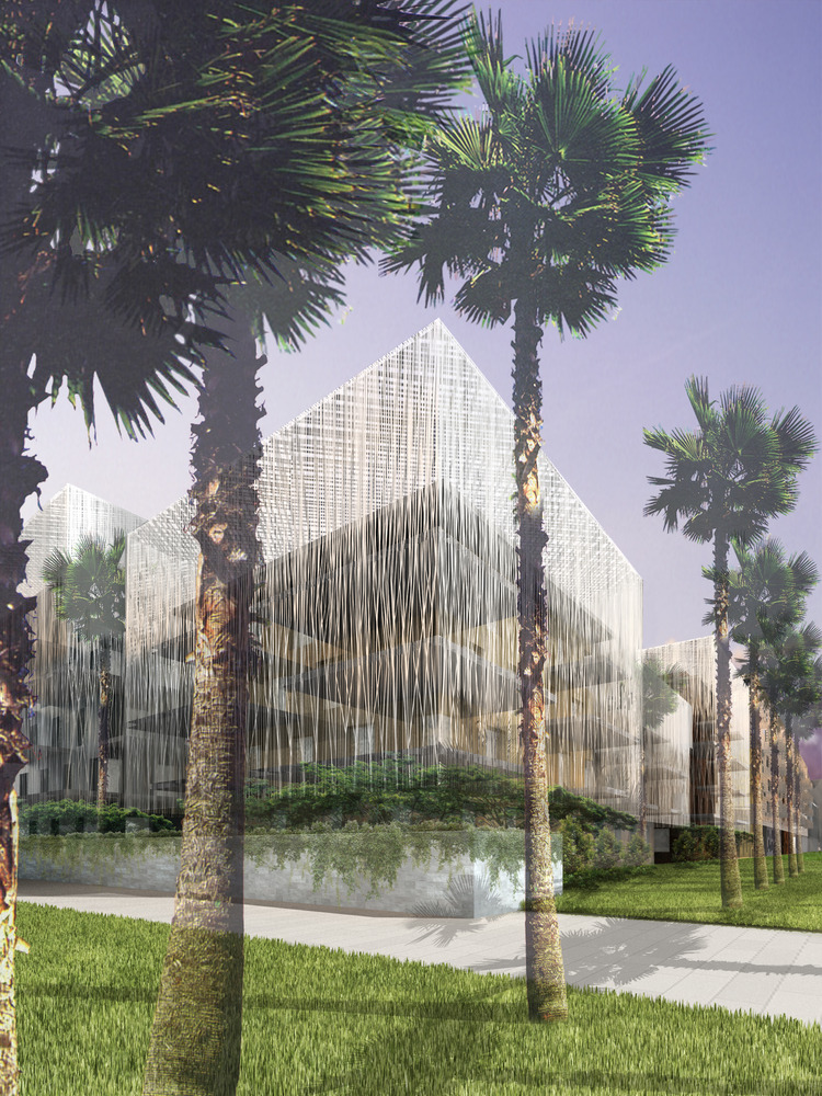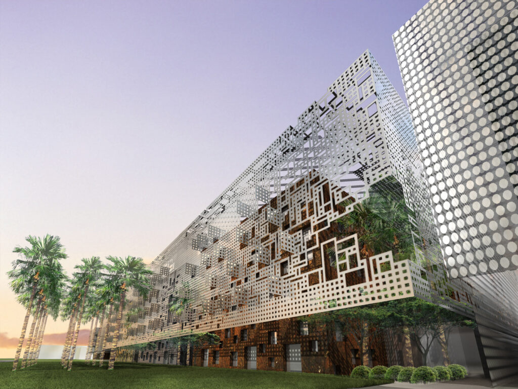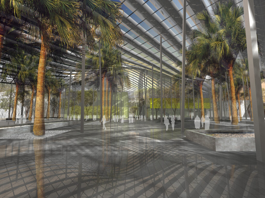 The design proposed creating comfortable enclosures within thermally modified environments via extensive shading devices, induced ventilation, integrated photovoltaics, night purging and hybrid systems maximising environmental performance.