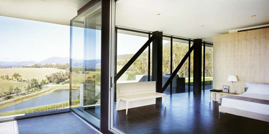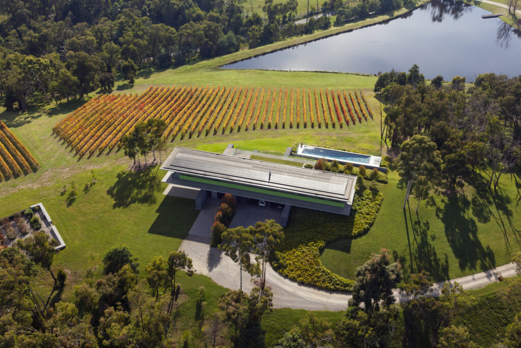 Medhurst House comprises a simple steel framed glass box cantilevering over the landscape to maximise views of the vineyard.