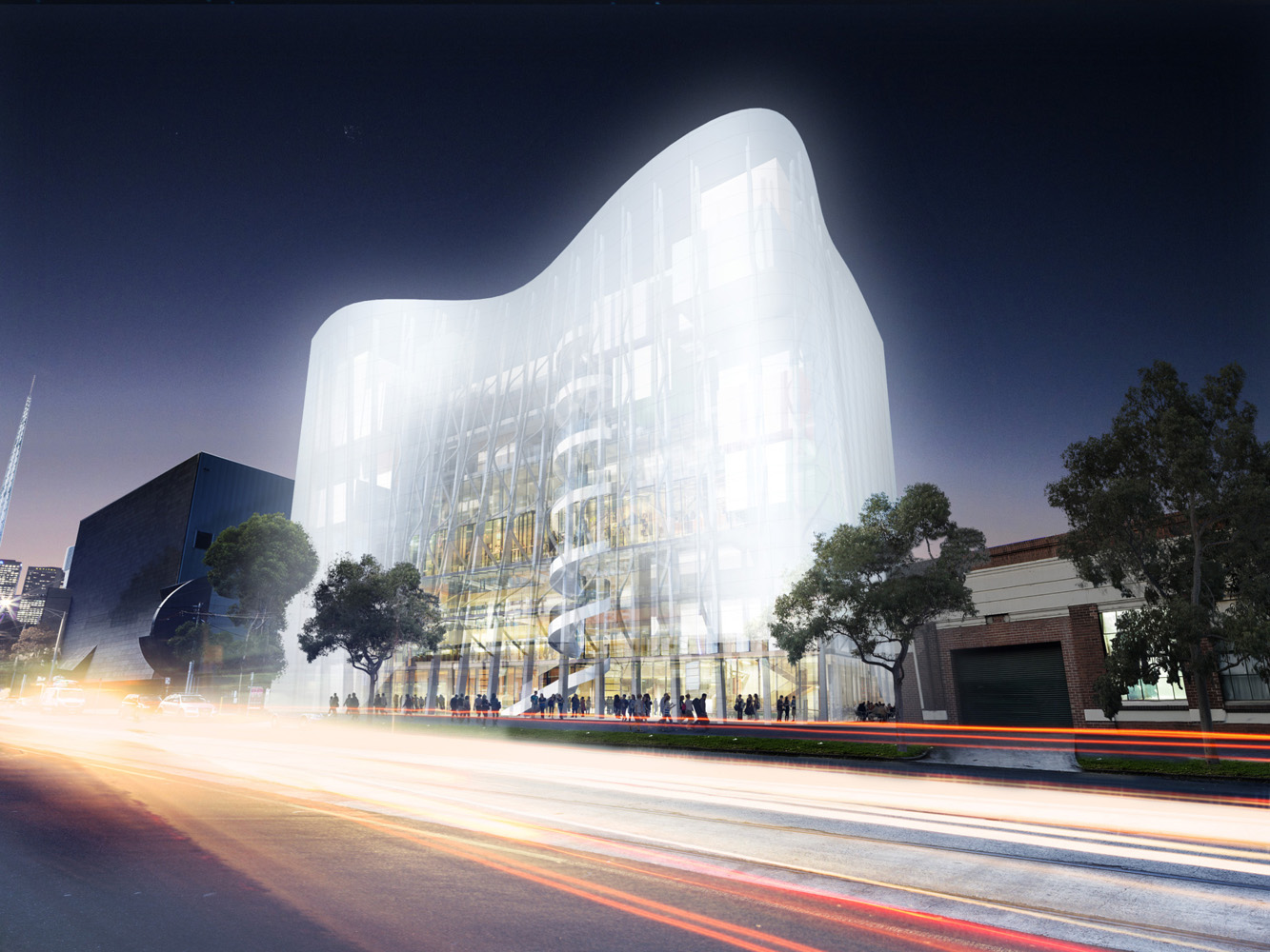 Denton Corker Marshall was invited to participate in a design competition for the new Melbourne Conservatorium of Music. The proposed design is about movement and transparency, and expresses the energy, vitality and sensibility of music in built form, both internally and externally.