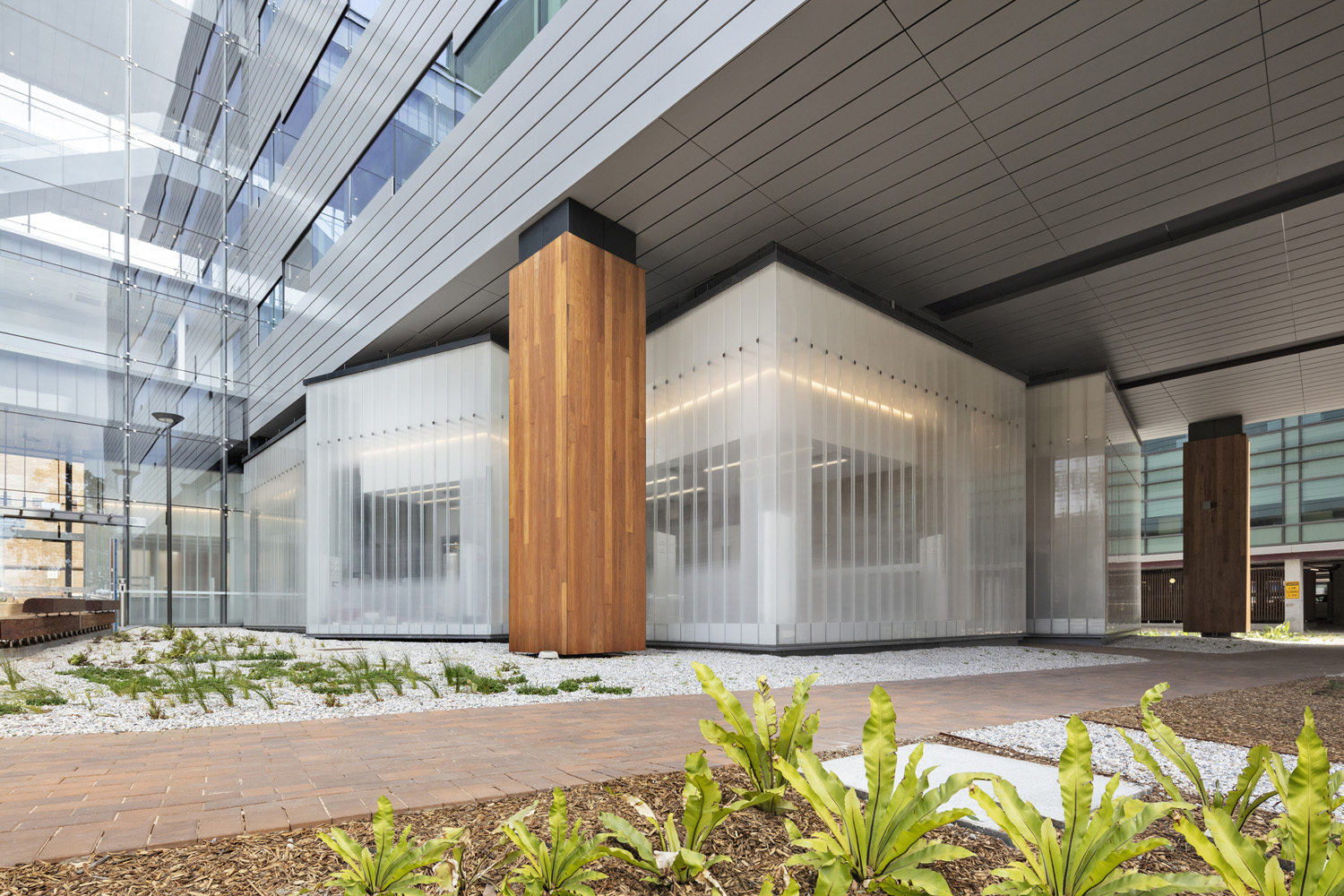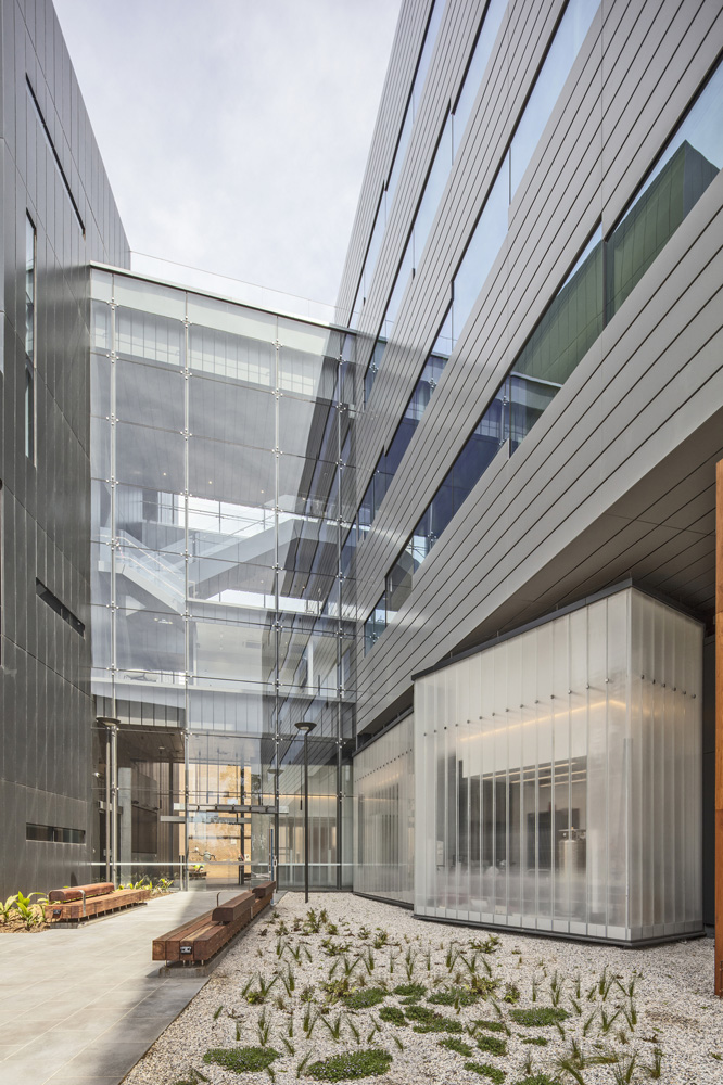 The design response creates two blocks: a services and lift block clad in charcoal aluminium, and a glazed laboratory wing. They are connected via a transparent link containing breakout, meeting spaces and ‘science-on-display’, promoting interaction. Informal outdoor learning extends the interaction into the landscape.