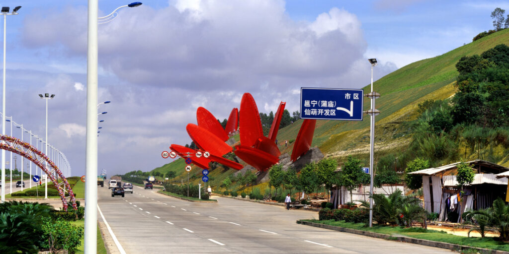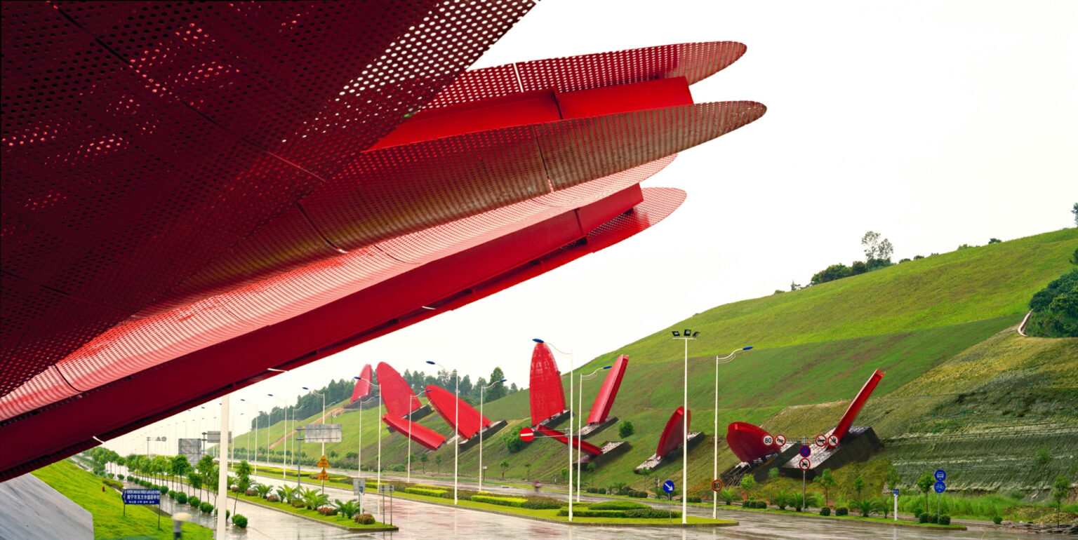 The Nanning Gateway is a strong statement for visitors travelling into the city from the airport. Viewed while pulling away from toll gates, the design presents a pair of monumental sculptural flowers flanking the freeway.