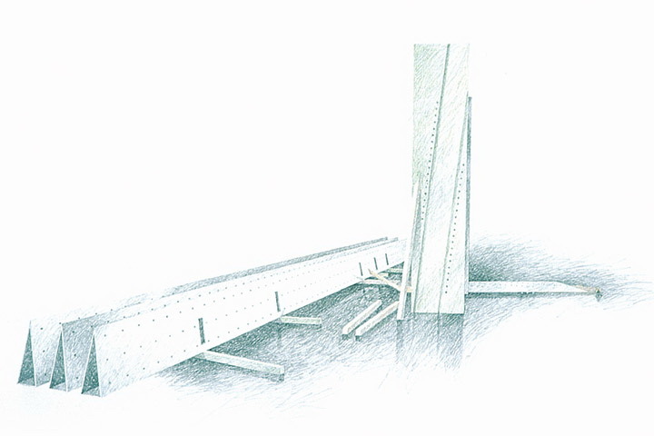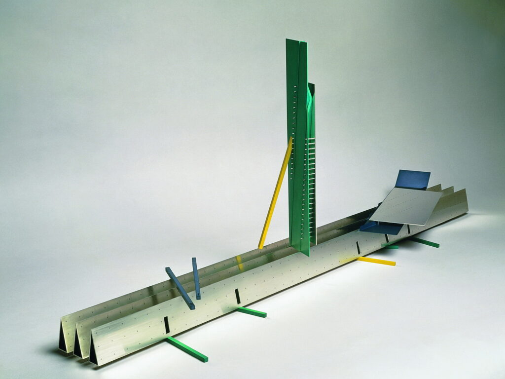 The design explores the contemporary centrepiece as an organising element for a table setting. It consists of three thin parallel tubular wedges in silver, 1,200mm long, supporting a tray and various abstracted forms made from sheets of silver plate and anodised aluminium. A vase and salt and pepper pots are incorporated, and the base can support a range of other items. The silver wedges, inlaid with a grid of flush monel dots, rest on randomly strewn coloured aluminium sticks.