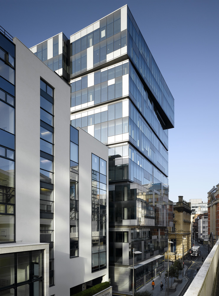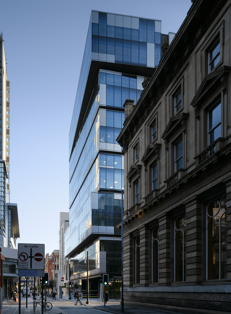 The two-storey over-scaling of horizontal elements emphasises the simplicity of the building block aesthetic. It also provides a powerful focus when looking from Piccadilly Gardens down Mosley Street, while creating a new anchor to the street.