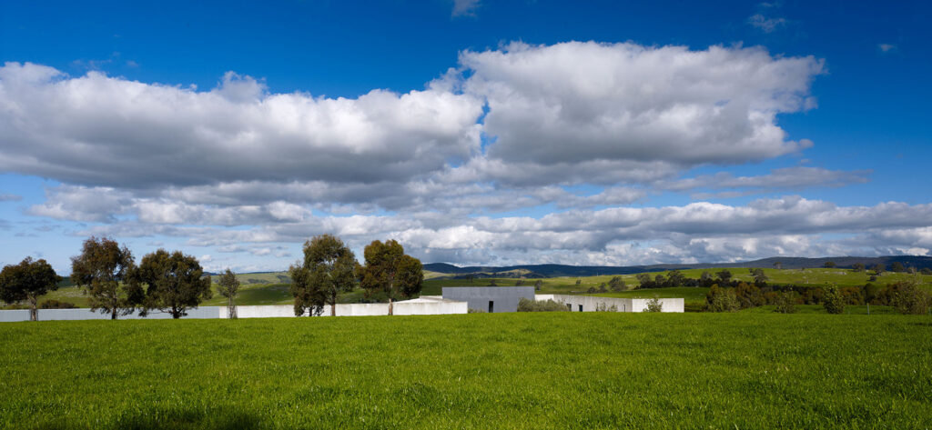An isolated farm homestead with a guest wing to one side, and machinery and shearing sheds to the other is conflated into a single object set in the open landscape.