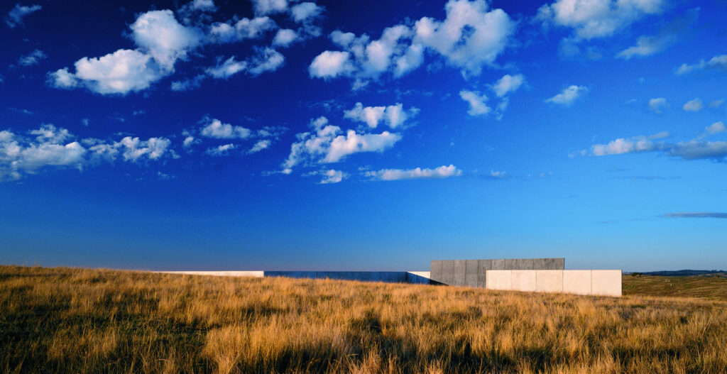 A heroic concrete wall, 200 metres in length, protects and orders the ensemble of buildings and accomplishes the iconic task of locating the complex in the wide panorama.  On one hand, its mass and weight give substance to the buildings and provide a buffer against the climate; on the other, it operates almost literally as a ruler, giving scale to the buildings in the horizontal limitlessness of the landscape.