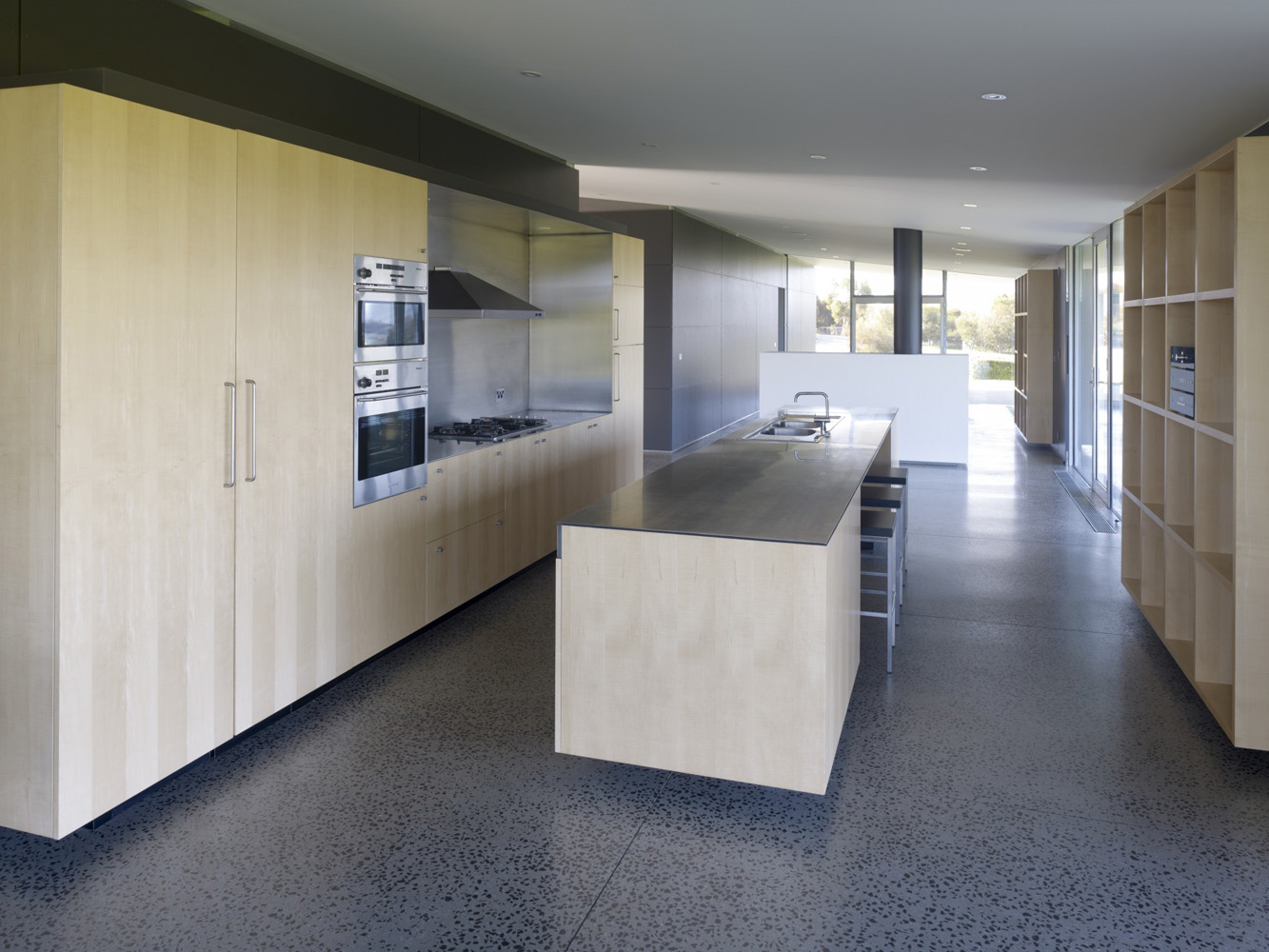 Entry is through a skewed slit in a monumental tilted concrete slab.  Behind it, the house is oriented north towards the sun and east to the views.  Between the house and tilted wall, a breezeway provides a covered pathway to the sheds and guest wing.