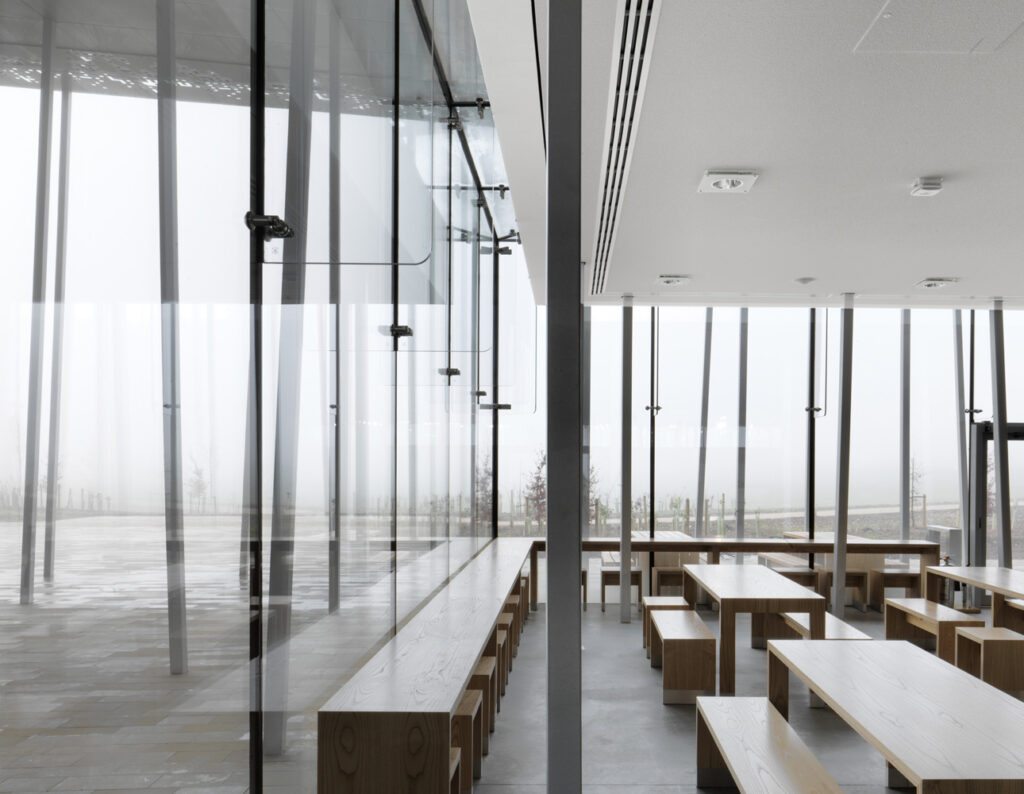 Supported by slender angled stick columns, a non-reflective metal roof shelters various visitor amenities.  Its edges are perforated to dapple the light reaching the exhibition and education facilities housed below in a pair of single-storey cubes, one glass and the other timber.