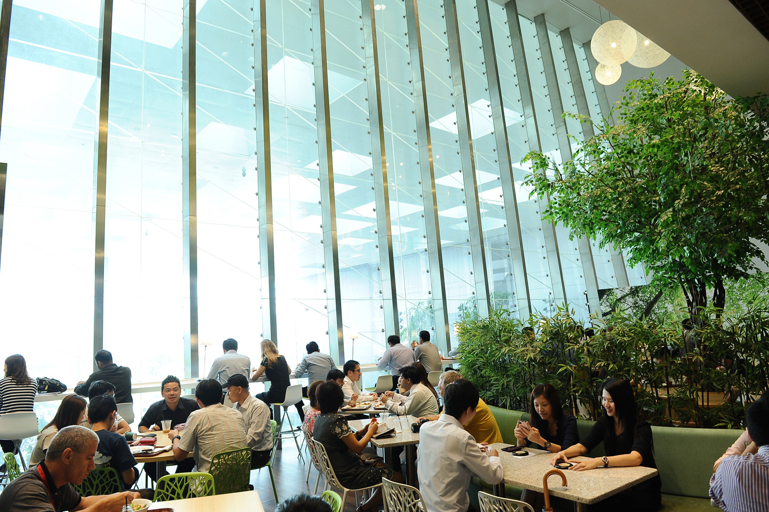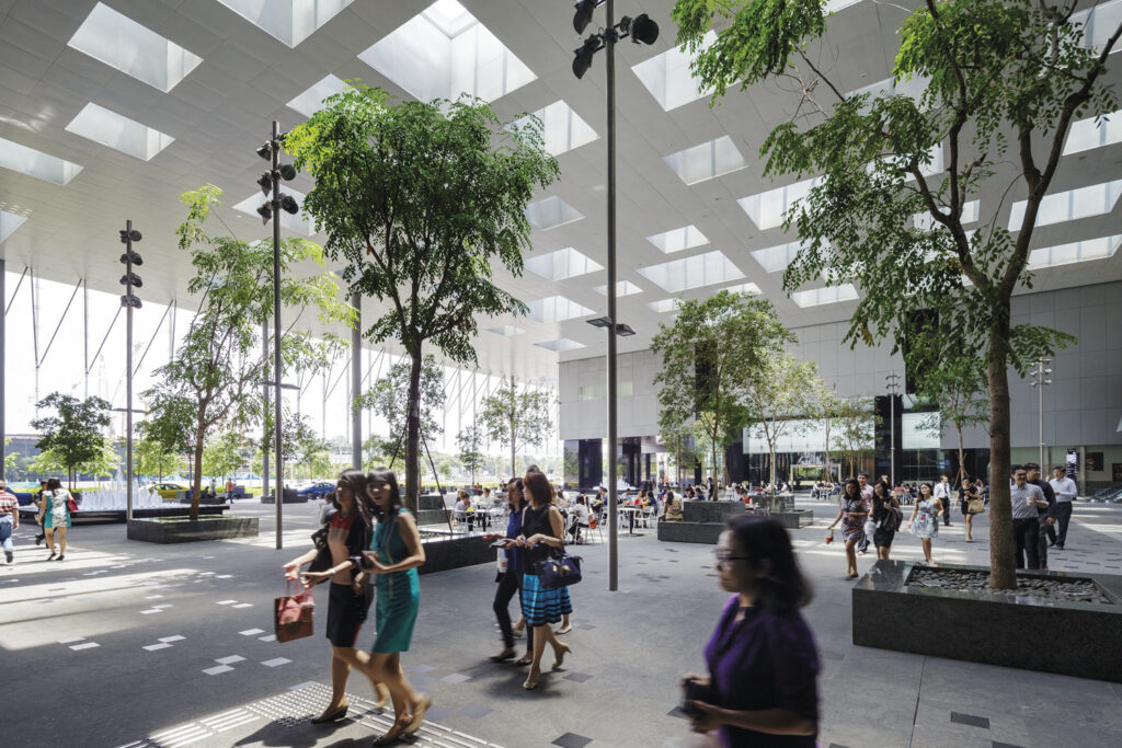 The Cube at Asia Square is a 17 metre high, 6,000m² city room, sitting within a total of 9,300m² of covered open space.  It is designed to accommodate both local office workers, and visitors associated with precinct, and city wide gatherings and events.