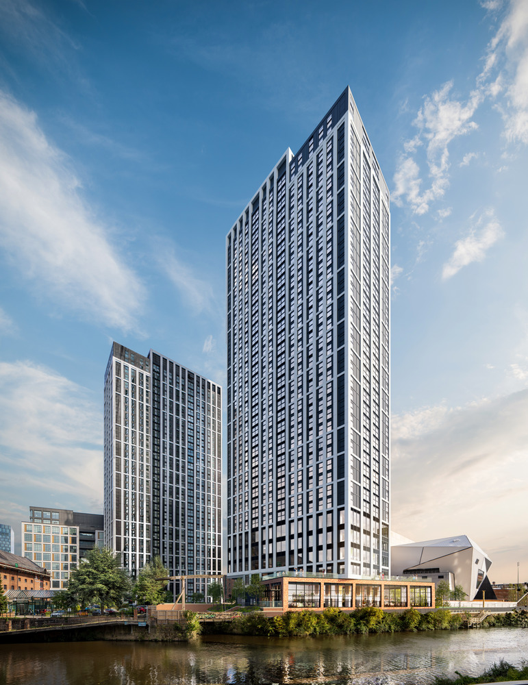 The buildings are at the core of St. John’s Enterprise City, one of Manchester’s primary regeneration areas. They are designed as a pair, united by their materiality but subtly distinguished by their overall architectural composition with an articulated silver-grey ‘grid’ laid over a dark ‘box’. The vertical ‘grid’ spans two and four storeys to emphasise their slender form.