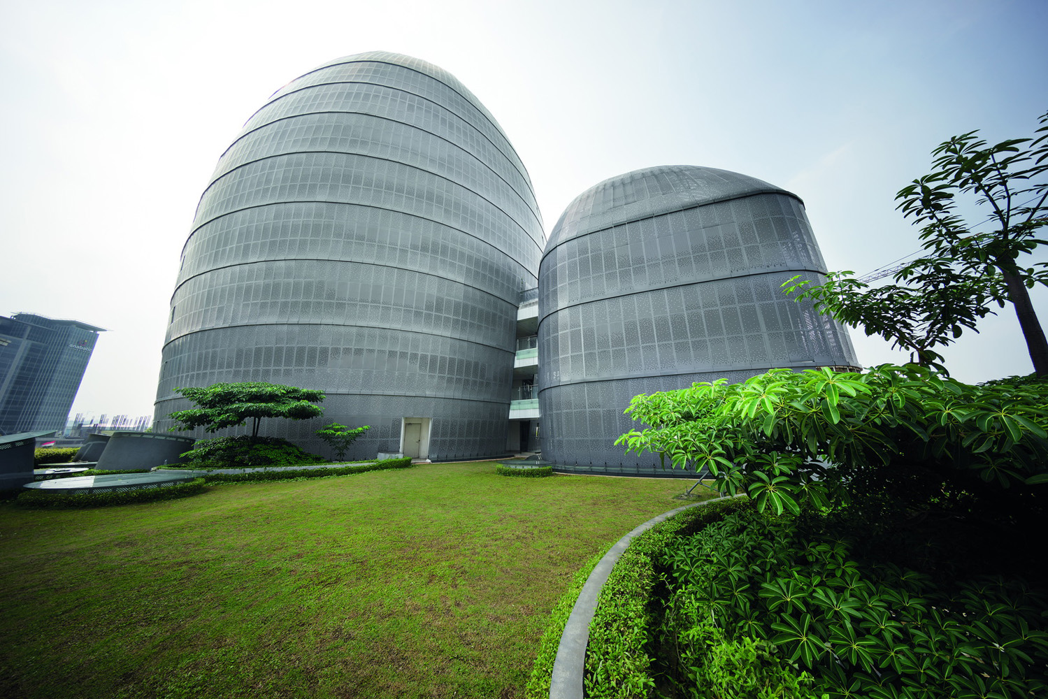 The design of the university is at the forefront of Indonesian ESD (environmentally sustainable design). Buildings are oriented with major facades facing north and south to minimise heat gain, rain and surface water is harvested and stored for recycling, grey water is recycled for irrigation and water-cooled air conditioning and energy is conserved through the use of energy efficient lighting and cooling. The double skin facade and large mature trees reduce ambient temperature. The carbon footprint is minimised with the use of local materials and manufacture and students are encouraged to bicycle around the campus, with the provision of bicycle parking and showers.