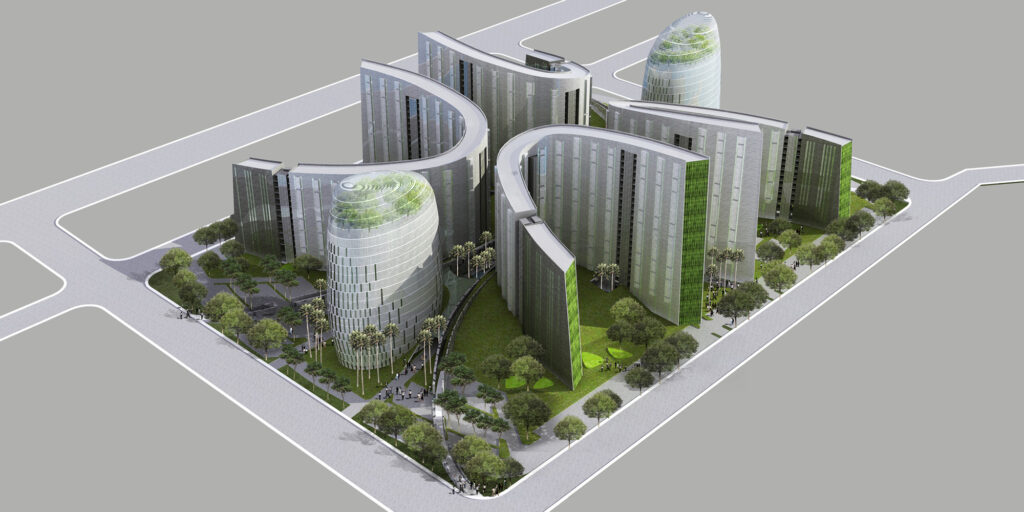 A series of soft, curvilinear axes link open spaces and buildings of the new multi-media university. Two main towers form the hub of the main campus with a graduate school and dormitory accommodation continuing the main north-south axis. Four curvilinear student dormitory buildings are sited in a cluster.