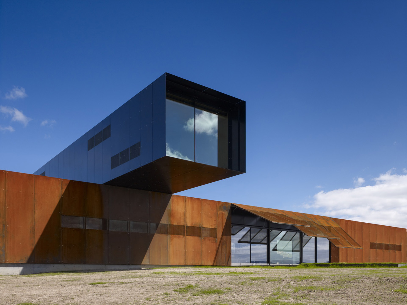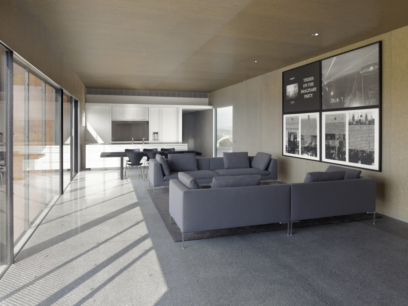 The inside is formed by the minimalist aesthetic that shapes the exterior. A second skin of grey-green stained strand board lines the interiors. White boxes break the internal volume into bedrooms and offices on the ends, and living space in the middle. Double glazed windows in the sides and ends of the long metal tube are concealed behind perforated panels. A large, north-facing, side of the corten box lifts up in three sections to create a sunshade across the 10 metre wide glazing to the central living area.