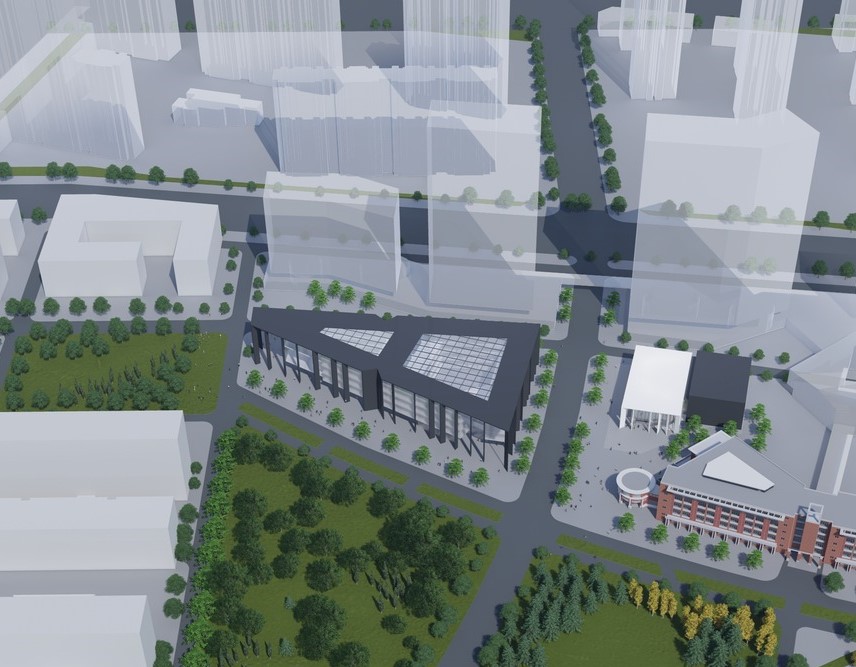 Our concept is part of a larger plan, including a 700-seat auditorium building as a separate stage. The two buildings are intended to read together as a harmonious composition, framing a significant new gateway entry for the campus.