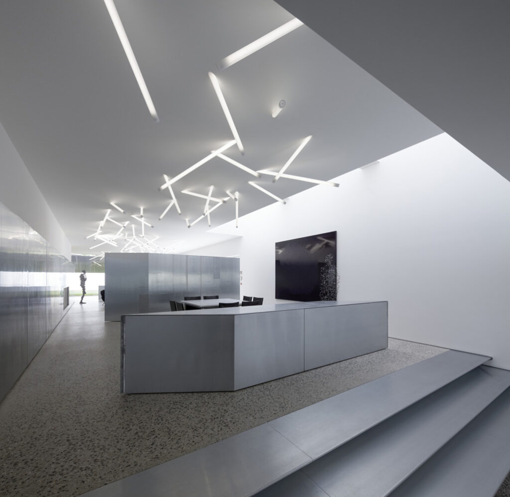 Ingeniously integrated with factory remnants and level constraints on the site, the new building is a strong yet respectful neighbour in its inner urban precinct. The simple austere grey cement façade hints at the first use of zinc deployed in the blade screen that stretches across a large horizontal aperture.