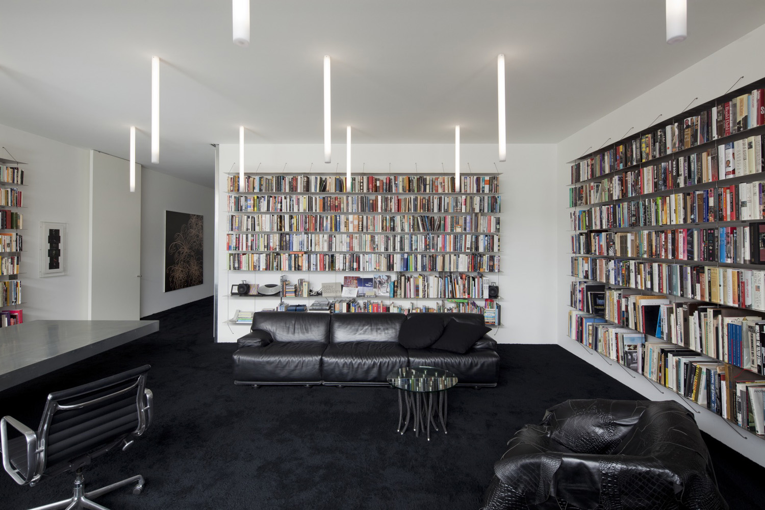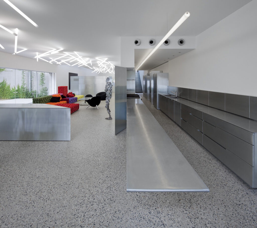 From the front door onwards it is the dextrous use of zinc which permeates throughout, softening the other palette of concrete floors and plaster. A section of thick zinc-clad wall pivots to allow access through an art gallery and living space, to the more private spaces of the house. Art and family living merge and flow throughout.